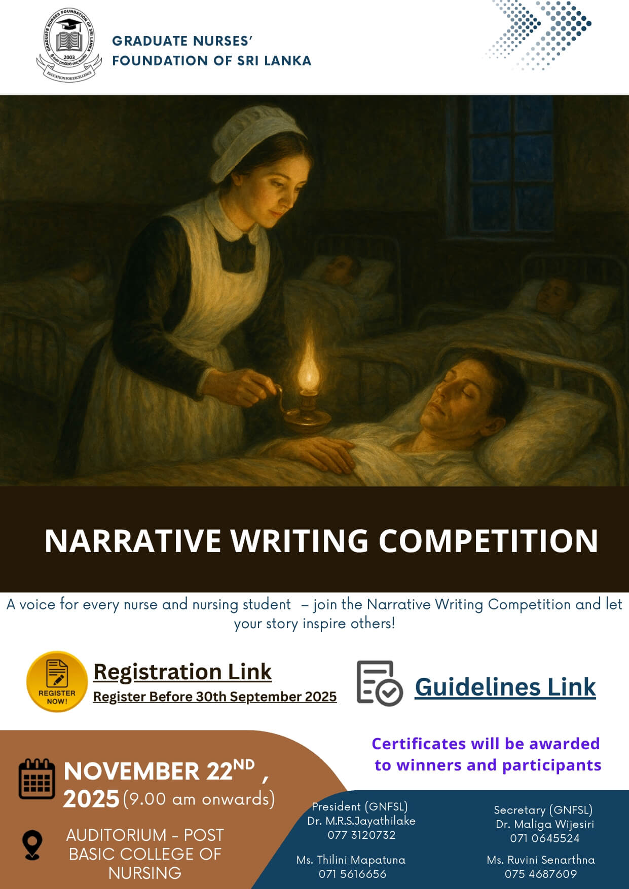 We are pleased to announce the Narrative Writing Competition 2025, organized by GNFSL, for all nurses and nursing students.